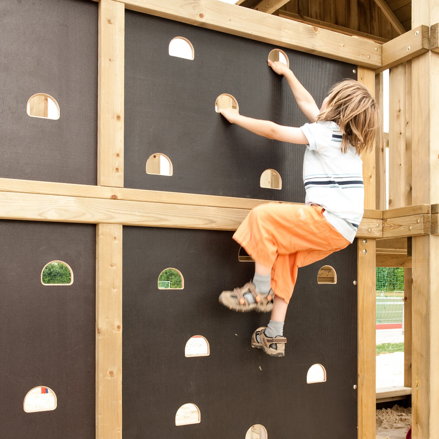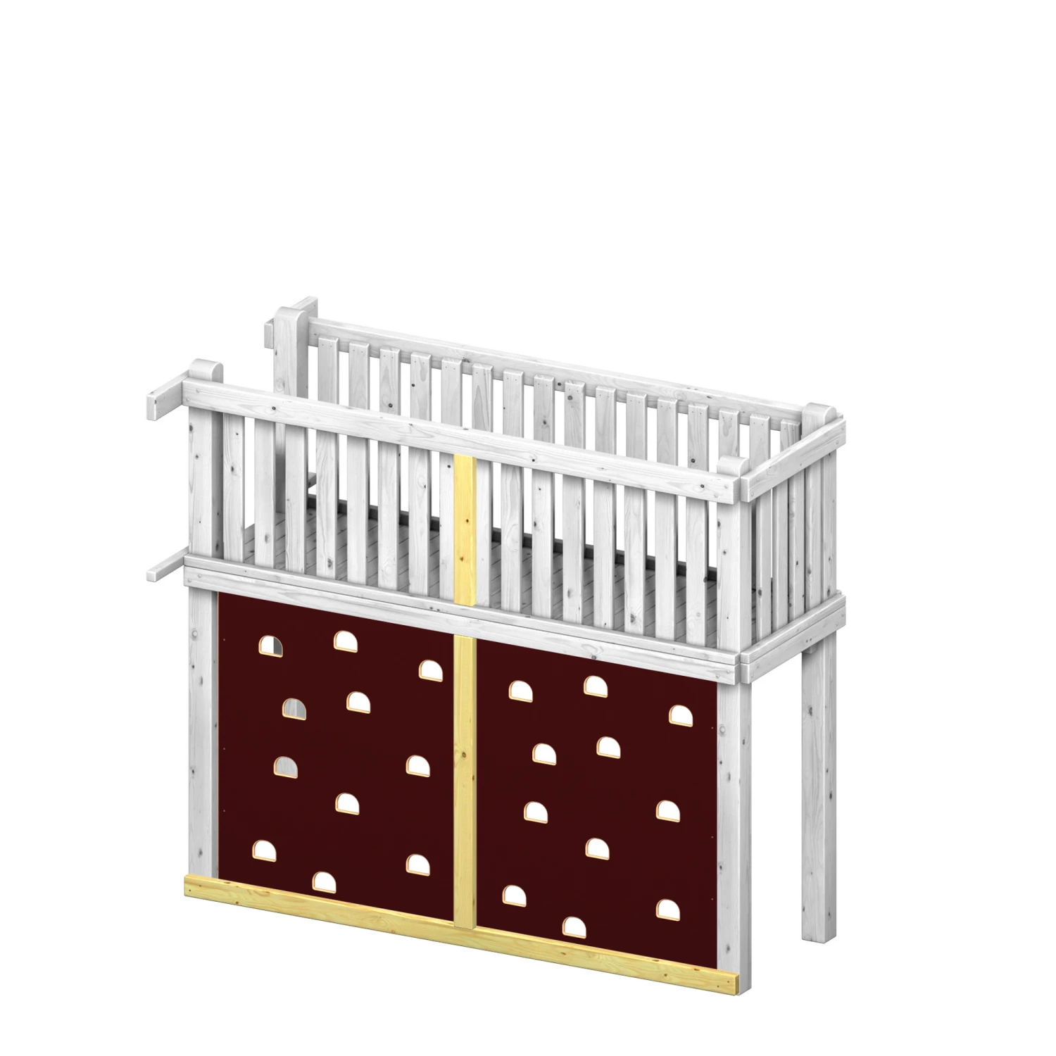 Die Kletterwand ‚Winnetoo Pro‘ wird im unteren Teil der Brücke befestigt. Sie besteht aus einer 18 mm starken Siebdruckplatte und ist mit je 11 gerundeten Grifflöchern versehen. ‚WINNETOO PRO‘ ist nach der DIN EN 1176 Norm gefertigt, welche die Anforderungen für Spielgeräte im öffentlichen Spiel- und Wohnumfeld regelt.