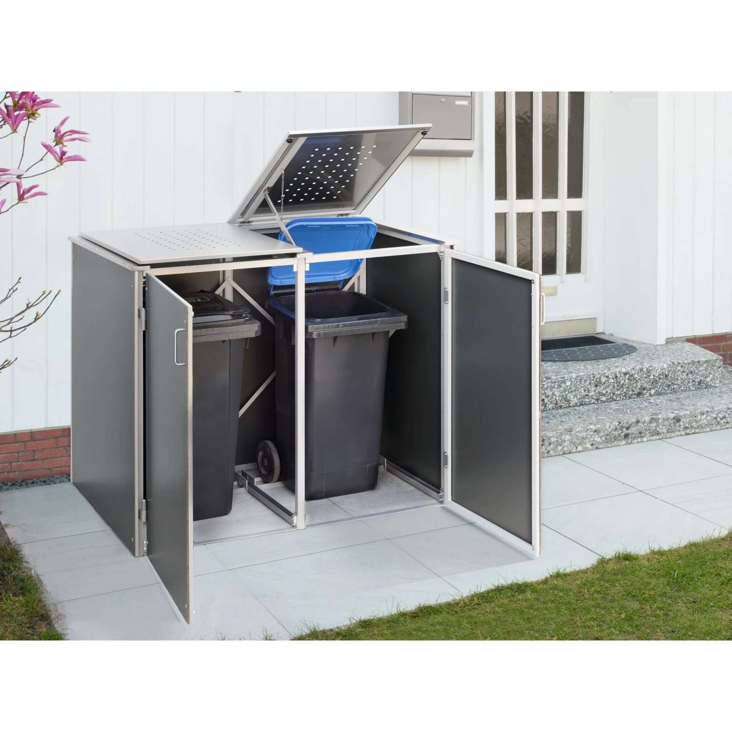 BINTO HPL-SYSTEM‘ – schöner und variabler lassen sich Mülltonnen nicht verstecken. Wähle aus verschiedenen Materialien und Farben oder stelle dir deinen individuellen Materialmix zusammen. Das Grundgerüst aus verzinktem Stahl ist bei allen Design-Varianten gleich. Du kannst sie jederzeit erweitern oder die alte Verkleidung durch eine neue ersetzen. Dazu wähle entweder Klappdeckel oder die Edelstahl-Pflanzschale. In die BINTO Boxen passen alle gängigen Tonnen bis 240 Liter und mit einer Einstellbreite von 63,3 cm. HPL ist ein Verbundwerkstoff aus Papier und Harz. Unser HPL ist speziell beschichtet und wetterfest. Es verliert im Laufe der Jahre etwas an Farbintensität, was allerdings weniger auffällt als z. B. Farbeindrücke durch Lichtschwankungen.