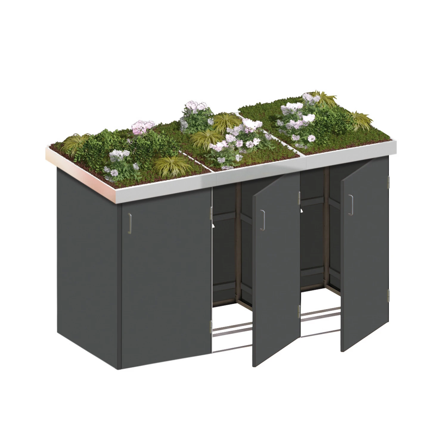 BINTO SYSTEM – schöner und variabler lassen sich Mülltonnen nicht verstecken: Wähle aus verschiedenen Materialien und Farben oder stelle dir deinen individuellen Materialmix zusammen. Das Grundgerüst aus verzinktem Stahl ist bei allen Design-Varianten gleich. Du kannst jederzeit erweitern oder die alte Verkleidung durch eine neue ersetzen. Dazu wählst du entweder Klappdeckel oder die Edelstahl-Pflanzschale. In die BINTO Boxen passen alle gängigen Tonnen bis 240 Liter und mit einer Einstellbreite von 63,3 cm.