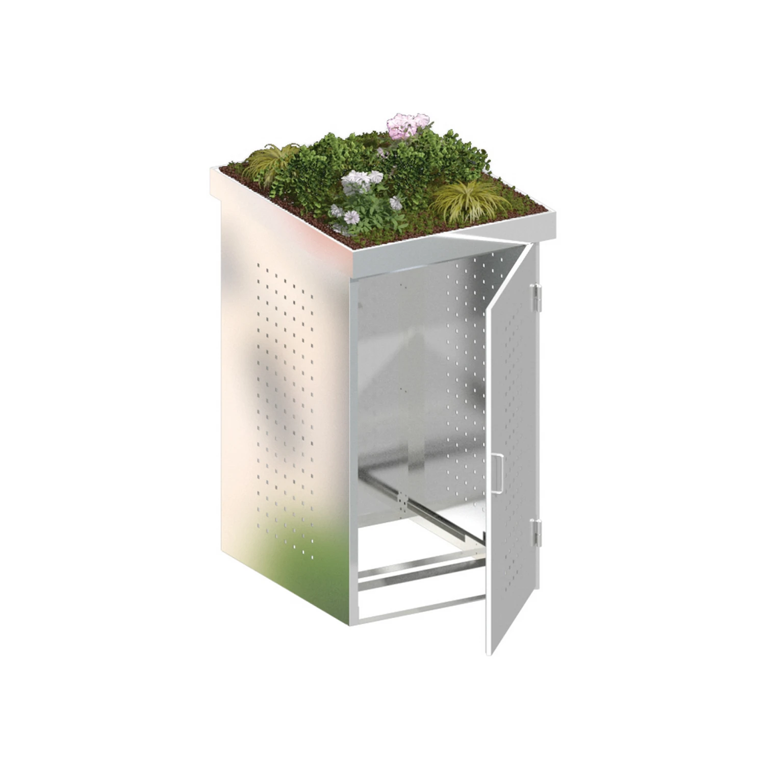 BINTO SYSTEM – schöner und variabler lassen sich Mülltonnen nicht verstecken: Wählen Sie aus verschiedenen Materialien und Farben oder stellen Sie sich Ihren individuellen Materialmix zusammen. Das Grundgerüst aus verzinktem Stahl ist bei allen Design-Varianten gleich. Sie können jederzeit erweitern oder die alte Verkleidung durch eine neue ersetzen. Dazu wählen Sie entweder Klappdeckel oder die Edelstahl-Pflanzschale. In die BINTO Boxen passen alle gängigen Tonnen bis 240 Liter und mit einer Einstellbreite von 63,3 cm.