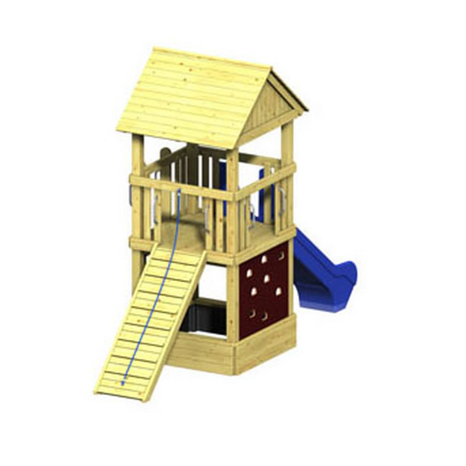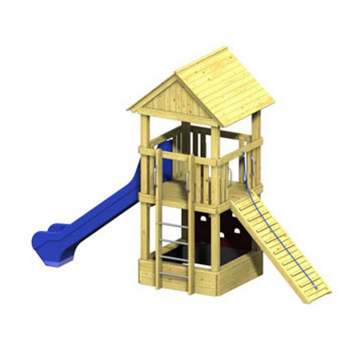 Das Spielgerüst ‚Winnetoo Pro‘ Variante 1 lässt Kinderherzen höher schlagen. Die Anlage hat einen Spielturm mit Dach. Unter dem Turm ist ein Sandkasten integriert. Der Klettersteg mit Halteseil, die Kletterwand und die Leiter bieten verschiedene Möglichkeiten den Turm zu erobern. Über die Rutsche geht es dann ganz schnell wieder nach unten. Die Variante 1 besteht aus folgenden Elementen: 3001 Grundturm-Set, 3004 Sandkasten-Set, 3002 Dach-Set, 3005 Klettersteg-Set, 3006 Turm-Kletterwand-Set unten, 3015 Rutschen-Set blau, 3113 Edelstahlgriffe-Set, inkl. aller Befestigungsmaterialien und Bodenanker. ‚WINNETOO PRO‘ ist nach der DIN EN 1176 Norm gefertigt, welche die Anforderungen für Spielgeräte im öffentlichen Spiel- und Wohnumfeld regelt.
