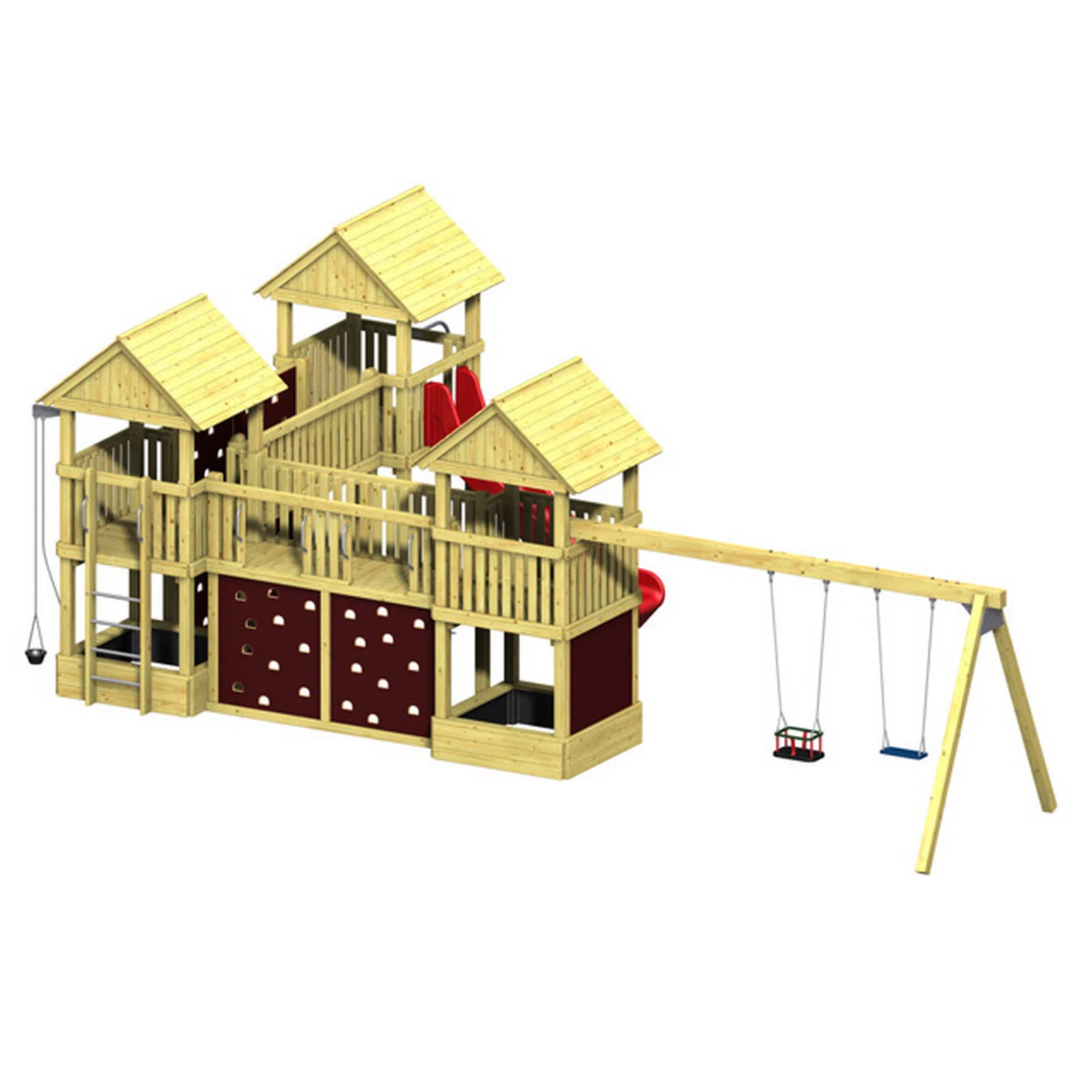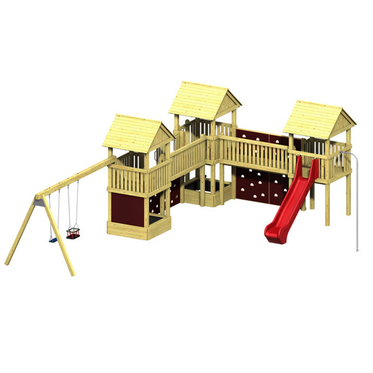 Das Spielgerüst ‚Winnetoo Pro‘ Variante 10 ist wie eine große Burg. Die drei Spieltürme sind durch Brücken miteinander verbunden. Ein Spielturm ist mit Rutsche und Feuerwehrstange, einer mit Leiter, Sandkasten und Sandeimer-Aufzug und der dritte mit Sandkasten und angebauter Schaukel ausgestattet. Über die Rutsche und Feuerwehrstange geht es dann ganz schnell wieder nach unten. Die angebaute Schaukel mit Babysitz und Schaukelsitz runden das ganze ab. Die Variante 10 besteht aus folgenden Elementen: 3 x 3001 Grundturm-Set, 3 x 3002 Dach-Set, 2 x 3003 Brücke-Set, 2 x 3004 Sandkasten-Set, 2 x 3008 Brücke-Kletterwand-Set unten, 3009 Brücke-Kletterwand-Set oben, 3 x 3113 Edelstahlgriffe-Set, 3013 Rutschen-Set rot, 3111 Sandeimer mit Kette/Rolle, 3068 Schaukelanbau-Set, 4 x 3221 Schaukelgelenk, 3108 Schaukelsitz blau, 3109 Babysitz, 3063 Aussteifungswand, 3107 Feuerwehrstange, inkl. aller Befestigungsmaterialien und Bodenanker. ‚WINNETOO PRO‘ ist nach der DIN EN 1176 Norm gefertigt, welche die Anforderungen für Spielgeräte im öffentlichen Spiel- und Wohnumfeld regelt.