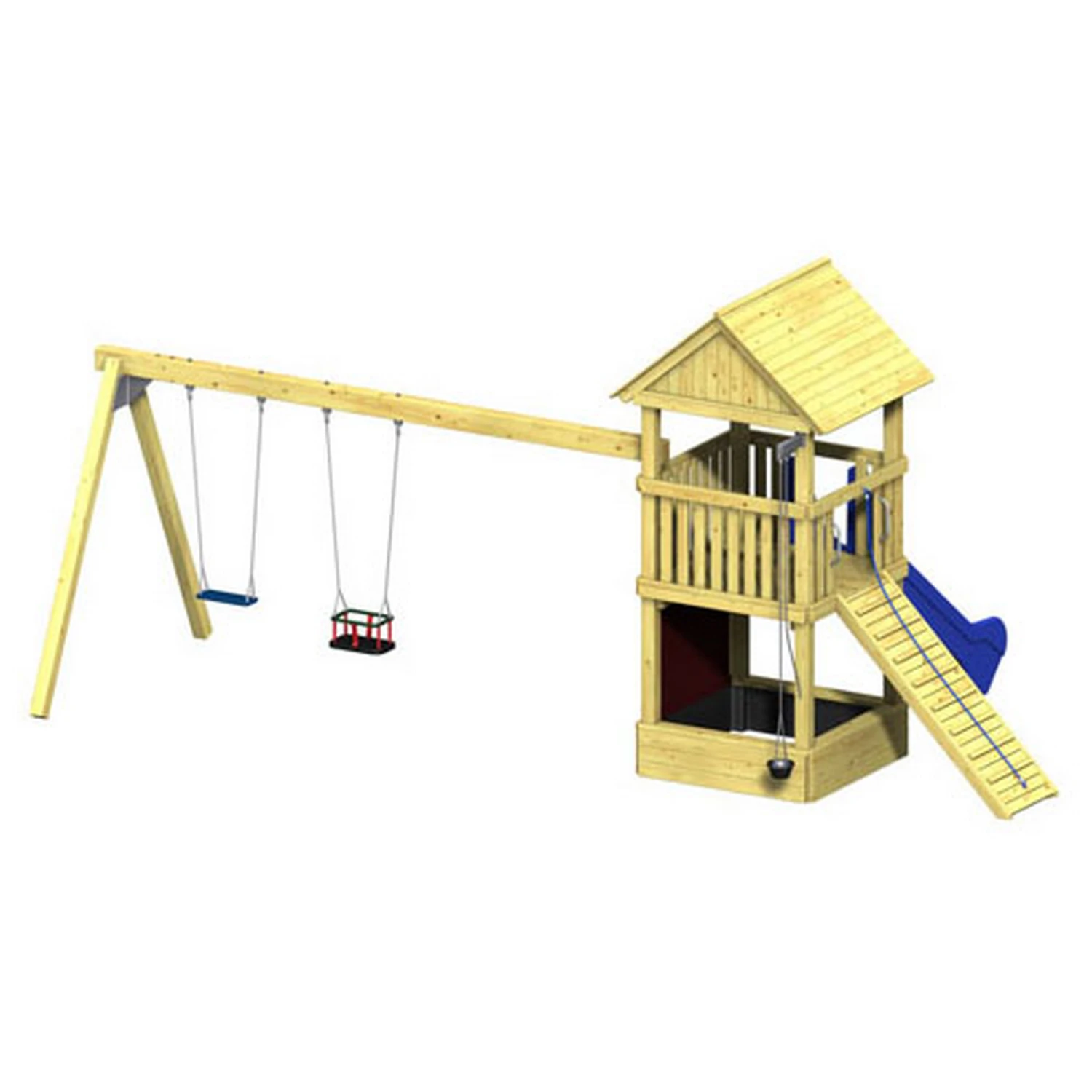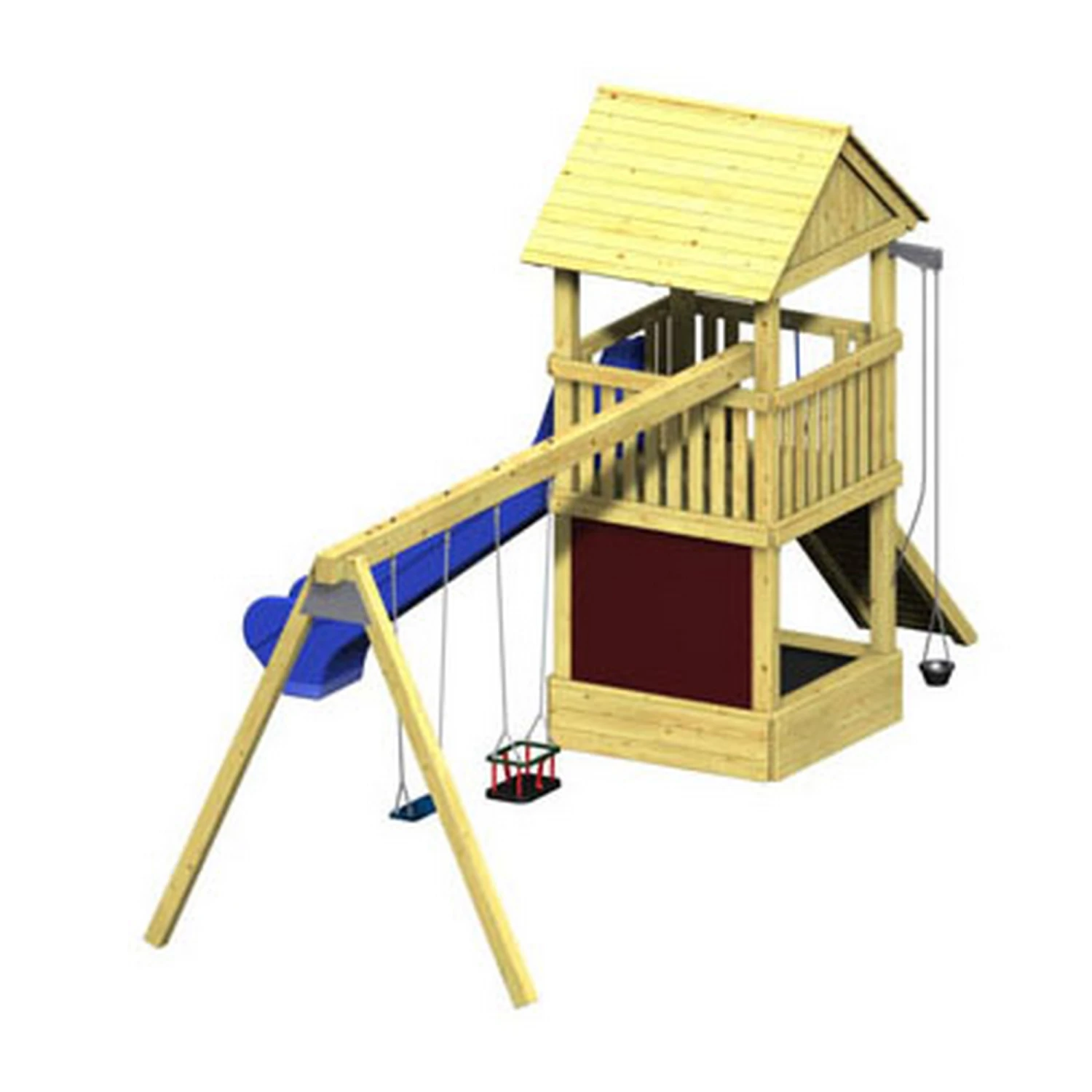 Das Spielgerüst ‚Winnetoo Pro‘ Variante 4 lässt Kinderherzen höher schlagen. Die Anlage hat einen Spielturm mit Rutsche und Klettersteg mit Halteseil. Ein Sandkasten und ein Sandeimer-Aufzug sind auch dabei. Über die Rutsche geht es dann ganz schnell wieder nach unten. Die angebaute Schaukel mit Babysitz und Schaukelsitz runden das ganze ab. Die Variante 4 besteht aus folgenden Elementen: 3001 Grundturm-Set, 3002 Dach-Set, 3004 Sandkasten-Set, 3113 Edelstahlgriffe-Set, 3015 Rutschen-Set blau, 3111 Sandeimer mit Kette/Rolle, 3068 Schaukelanbau-Set, 4 x 3221 Schaukelgelenk, 3108 Schaukelsitz blau, 3109 Babysitz, 3063 Aussteifungswand, 3005 Klettersteg-Set, inkl. aller Befestigungsmaterialien und Bodenanker. ‚WINNETOO PRO‘ ist nach der DIN EN 1176 Norm gefertigt, welche die Anforderungen für Spielgeräte im öffentlichen Spiel- und Wohnumfeld regelt.