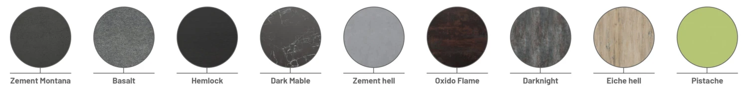 | Farben | Darknight, Zement, Eiche hell, Oxido Flame, Pistache, Basalt, Dark Marble, Hemlock, Zement Montana |
