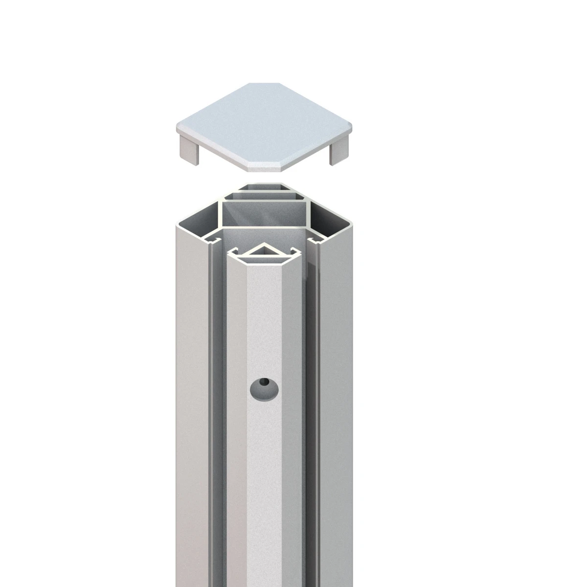 Der SYSTEM Eck-Klemmpfosten besteht aus 2 Halbpfosten, in die die Glas- und WPC-Elemente eingespannt und verschraubt werden können. Die Pfosten sind vorgebohrt und beinhalten passende Pfostenkappen.