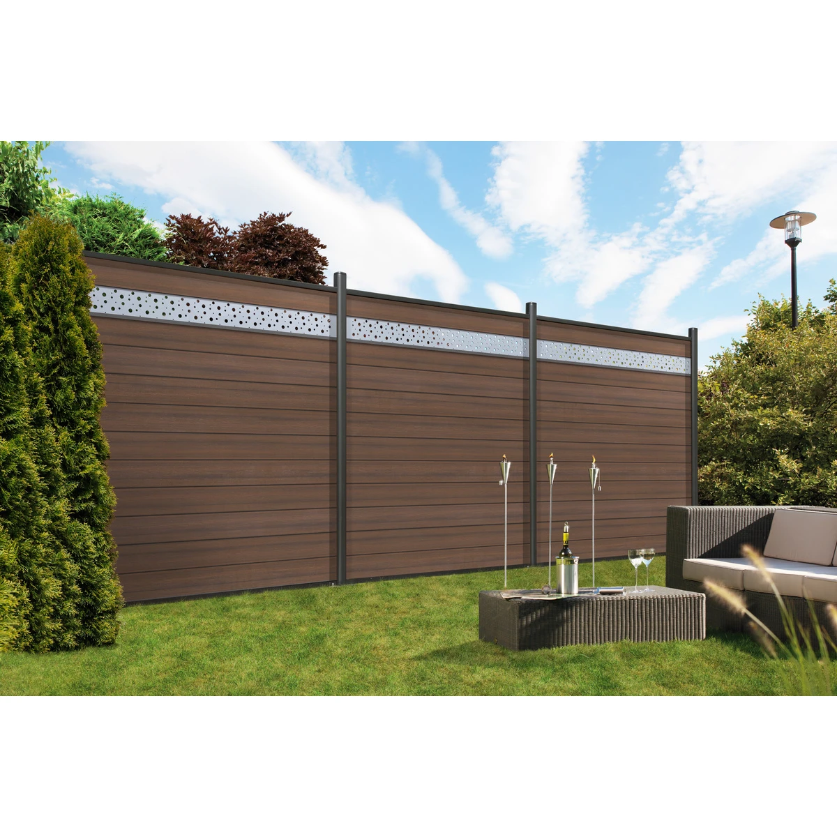 Die SYSTEM Steckzäune aus WPC bieten eine große Gestaltungsvielfalt. Durch den modularen Aufbau des Sichtschutzsystems sind Höhen und Breiten frei wählbar. Die Standardhöhe 180 cm wird durch 6 Nut-Feder-Profile, die in einem Zaun-Set enthalten sind, erreicht. Geringere Höhen im 30 cm Raster werden durch weniger verbaute Profile erzielt. Da sich WPC so leicht wie Holz bearbeiten lässt, können die Profile auf eine individuelle Breite gekürzt werden.