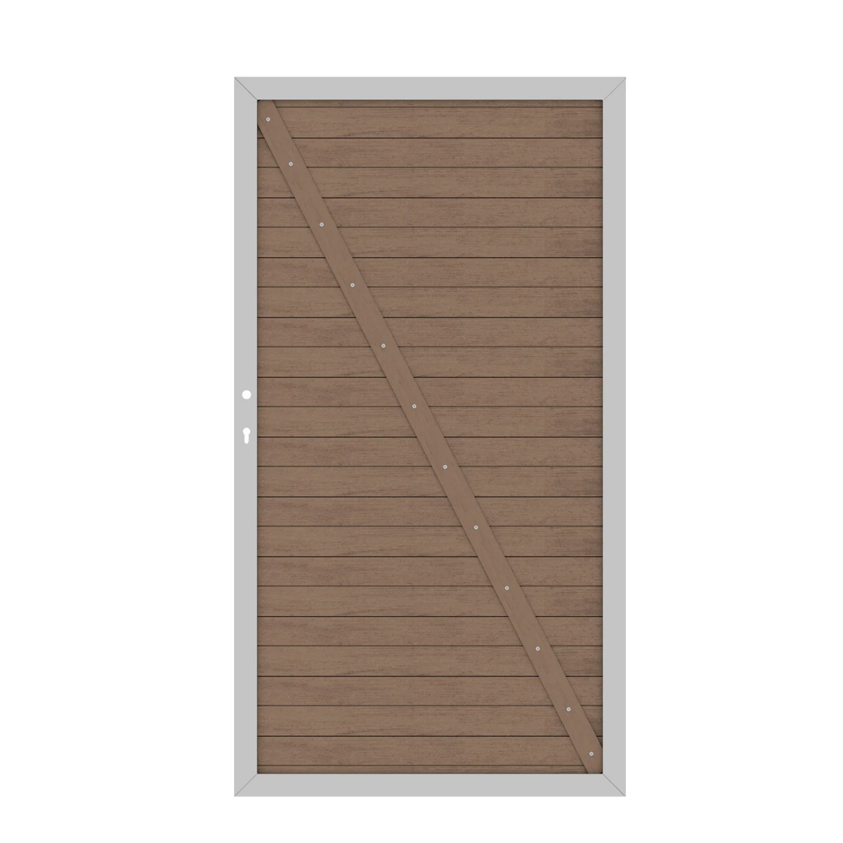 Beim robusten SYSTEM WPC Tor sind 12 Profile in einem umlaufenden Metallrahmen fixiert. Zusätzliche Stabilität gewährt die rückseitige Diagonalverstrebung. Der SYSTEM Torrahmen ist mit einer Tiefenbohrung versehen, in die das mitgelieferte Einsteckschloss eingebaut werden kann. Verwenden Sie zur Montage die verzinkten Metall-Torpfosten Art. 2099: 2er-Set inklusive angeschweißter Toraufhängung. SYSTEM WPC Tor Mandel DIN rechts Inklusive Beschlagsatz und Schloss