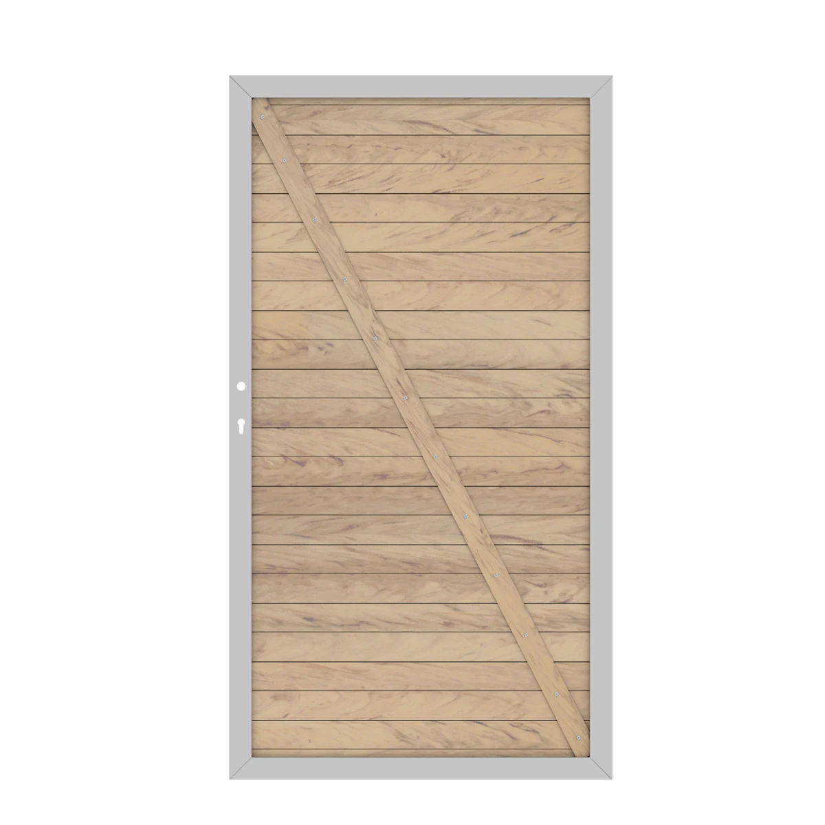 Beim robusten SYSTEM WPC Tor sind 12 Profile in einem umlaufenden Metallrahmen fixiert. Zusätzliche Stabilität gewährt die rückseitige Diagonalverstrebung. Der SYSTEM Torrahmen ist mit einer Tiefenbohrung versehen, in die das mitgelieferte Einsteckschloss eingebaut werden kann. Verwenden Sie zur Montage die verzinkten Metall-Torpfosten Art. 2099: 2er-Set inklusive angeschweißter Toraufhängung. SYSTEM WPC Tor Sand DIN rechts Inklusive Beschlagsatz und Schloss