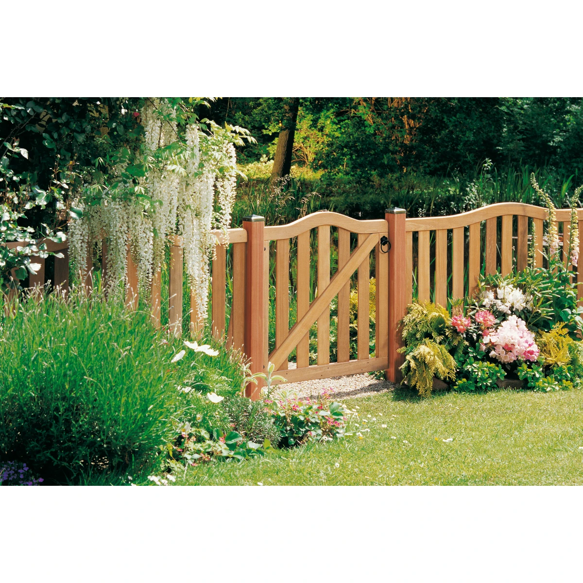 RAJA Hartholz ist aus FSC®-zertifiziertem Hartholz und besteht aus 12 x 88 mm starken Zaunprofilen, die an 36 x 78 mm starke Holme edelstahlverschraubt sind. Die Öffnung im unteren Bereich der Holme sorgt für optimalen Wasserablauf. Der Rundbogen ist aus einem Stück gearbeitet. Die Oberflächen von RAJA Hartholz sind glatt gehobelt und alle Kanten sind gerundet.
